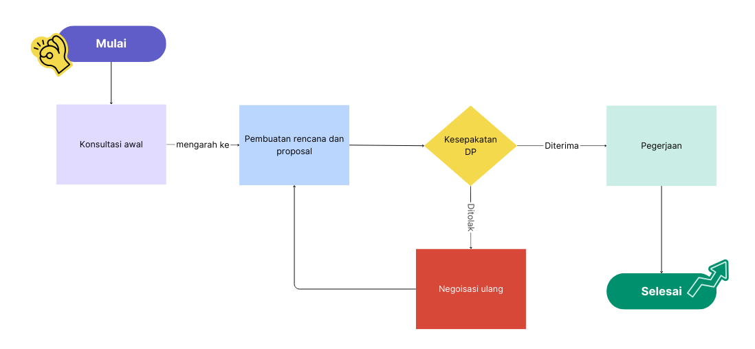 Setelah disepakati kedua belah pihak, klien melakukan pembayaran DP (uang muka), dan proyek mulai berjalan berdasarkan fitur yang telah disepakati di awal.